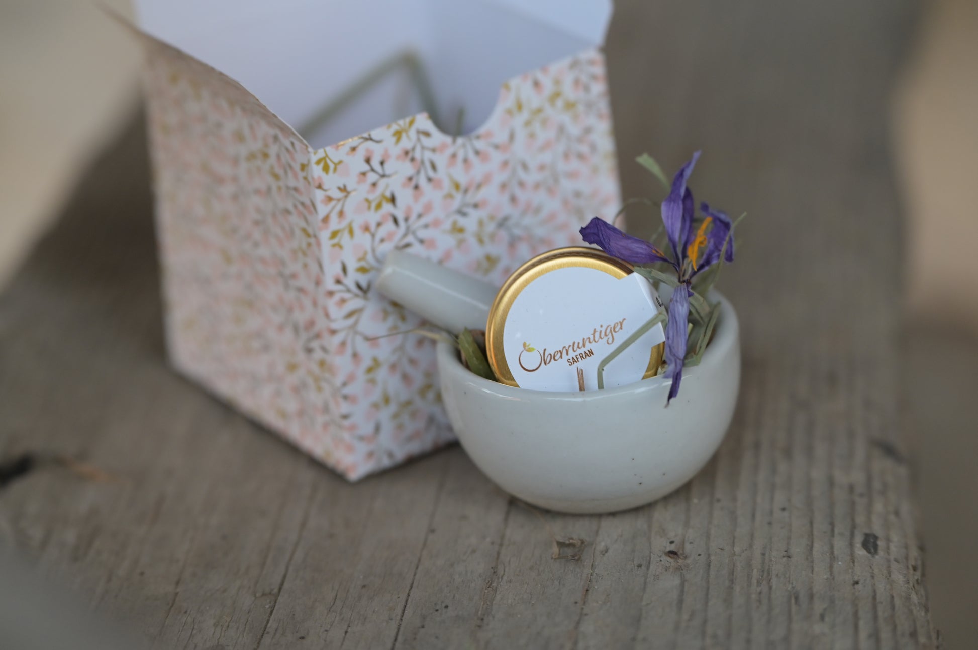 Safran in 0.25g Dose mit Mörser - zur perfekten Verarbeitung unseres Oberruntiger Safrans, in Geschenkverpackung.